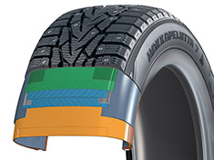 Nokian Tyres Hakkapeliitta 7 это настоящая революция в создании зимней резины.. Якорный шестигранный шип с расширенным нижним основанием показал невиданное ранее сцепление, как при разгоне, так и при торможении. А усиленный стальной брекер, сохраняя положение шипа неизменным, сделал шип прочным при боковом сопротивлении, повысив поперечное сцепление с трассой. Шины Nokian Tyres Hakkapeliitta 7 имеют ошиповку в восемь рядов по разным сторонам от центральной оси, но при этом количество шипов и масса шины не увеличено. Покрышку украшает совершенно новый рисунок протектора с усовершенствованной конструкцией. Усиленная центральная часть, скошенные плечевые зоны и трёхмерные ламели протектора, а также новейшая резиновая смесь на основе соединения каучука и силики делают покрышки стабильными на любой трассе, легкоуправляемыми, надежными, износостойкими, показывающими превосходные сцепные характеристики при любых погодных условиях. Ещё одна инновация шипованной шины Nokian Tyres Hakkapeliitta 7 - полная бесшумность. Добиться этого инженеры смогли при помощи воздушного амортизатора, выполненного в форме капли и расположенного у основания шипа. | ![]() |